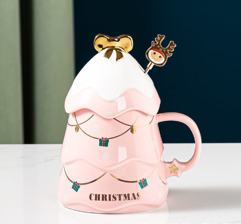 Ροζ χριστουγεννιάτικη κούπα σε σχήμα δέντρου με καπάκι που θυμίζει χιονισμένη κορυφή.
